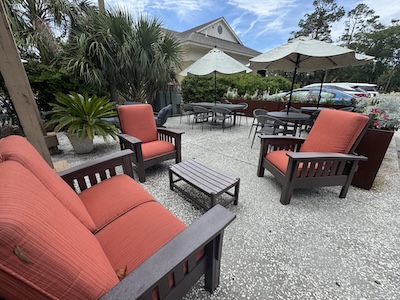 The outdoor patio is a beautiful, shaded area. It is famously dog-friendly, offering a pet menu so your furry friend can dine with you on the patio.