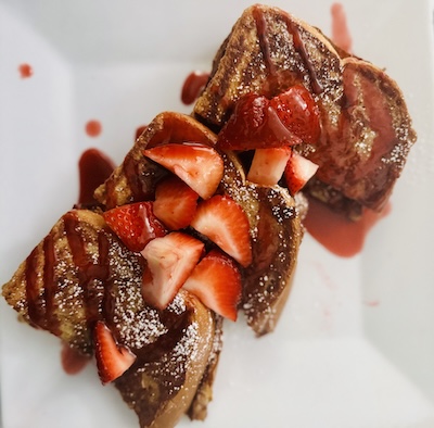 I ordered the vegan stuffed French toast, which was thick cut white bread dipped in cinnamon, vanilla & oatmilk, grilled & filled with Good Planet strawberry cream cheese, topped with fresh strawberries & a drizzle of strawberry puree. I was a bit skeptical about the “vegan” French toast, but it was so warm and delicious. I wish I could make this at home.