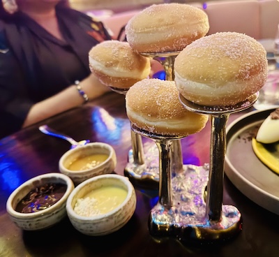 Warm cinnamon donuts with warm exotic cream and chocolate sauce