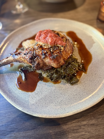 Matt enjoyed his dish also. He ordered the pork chop with gorgonzola, smoked ham hock collard greens, rhubarb marmalade, and demi-glace.